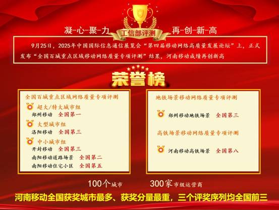 9月24日,中國工業(yè)和信息化部主辦的2025年中國國際信息通信展覽會在北京開幕,作為極具影響力的信息通信行業(yè)年度盛會,受到行業(yè)內(nèi)外廣泛關(guān)注。在其“第四屆移動網(wǎng)絡(luò)高質(zhì)量發(fā)展論壇”上發(fā)布了“全國百城重點區(qū)域移動網(wǎng)絡(luò)質(zhì)量專項評測結(jié)果”,河南移動移動網(wǎng)絡(luò)質(zhì)量全國領(lǐng)先,是全國獲獎城市最多、獲獎分量最重的省級運營商,三個評比組均位居全國前三,其中鄭州移動全國第一。河南移動連續(xù)四年保持強勢表現(xiàn),且持續(xù)提升再創(chuàng)新高。